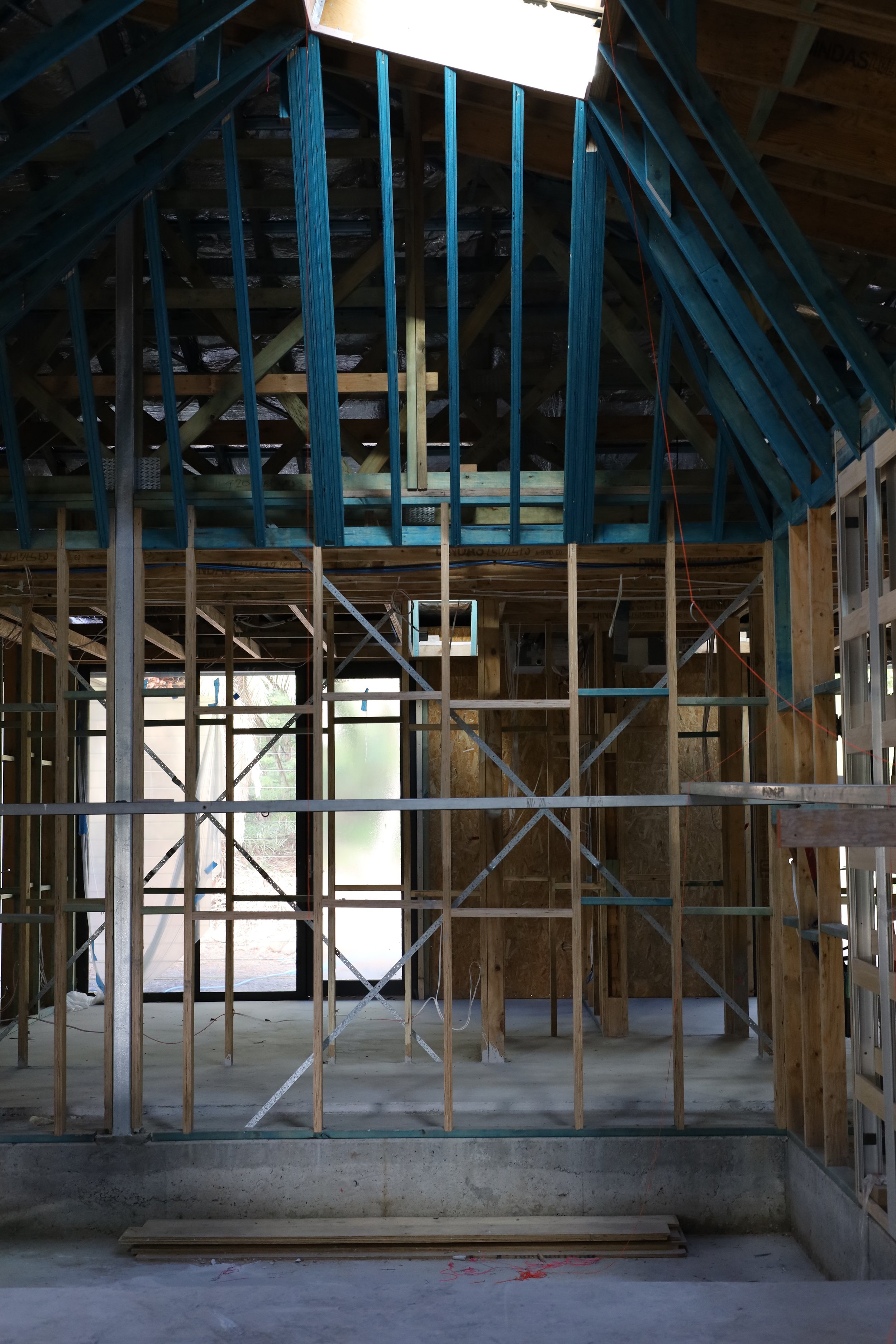 Timber cladding and natural stone bricks stop at the line of sharp interior voids.